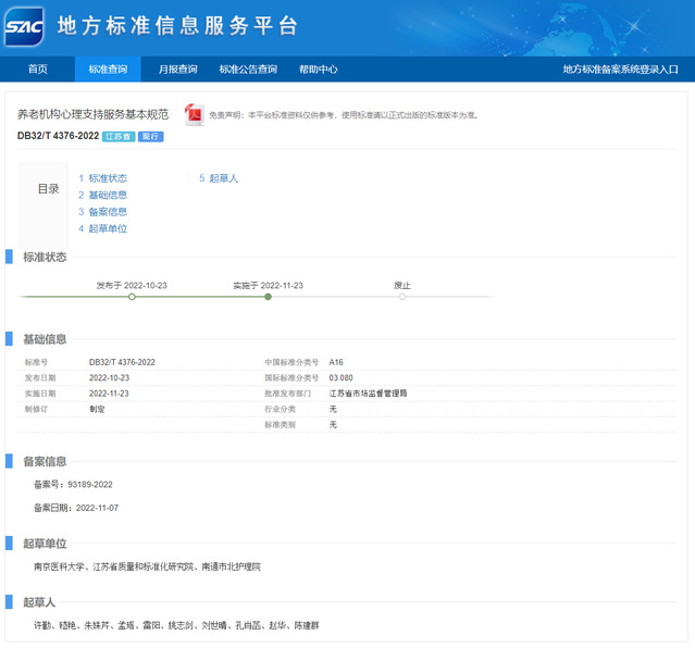 近日,由九游娱乐(JIUYOU)官方网站_9YOU GAME牵头组织编写的江苏省地方标准《养老机构心理支持服务基本规范》(DB32/T 4376-2022)正式发布。
