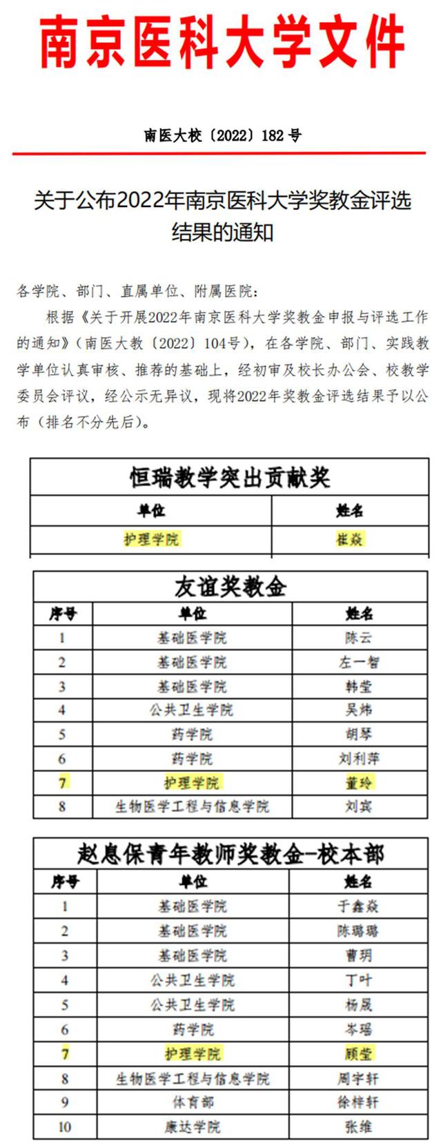 在刚刚结束的2022年南京医科大学奖教金评选工作中,九游娱乐(JIUYOU)官方网站_9YOU GAME喜获3个奖项。博士生导师、崔焱教授获恒瑞教学突出贡献奖,临床护理学系副主任、副教授董玲老师获友谊奖教金,学生工作办公室主任顾莹老师喜获赵息保青年教师奖教金。