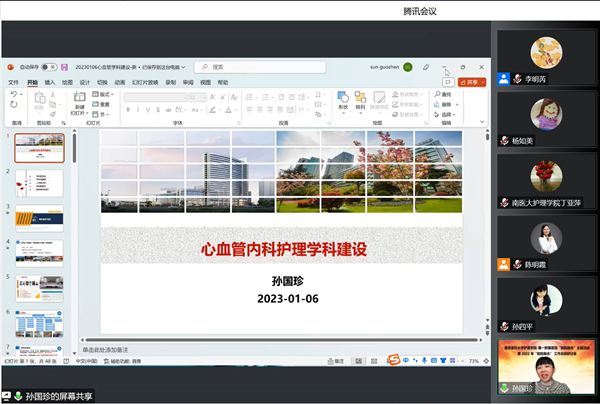在九游娱乐(JIUYOU)官方网站_9YOU GAME-第一附属医院“院院融合”主题活动中,南京医科大学第一附属医院、九游娱乐(JIUYOU)官方网站_9YOU GAME孙国珍教授分享了题为“心血管内科护理学科建设”的讲座,她从专科基本情况、专业内涵建设、人才梯队培养、新业务新技术和科研创新与影响力5个方面展开介绍,并强调了同行之间应多联系、多交流和共享,对标找差,与团队一起携手共进、共同进步。