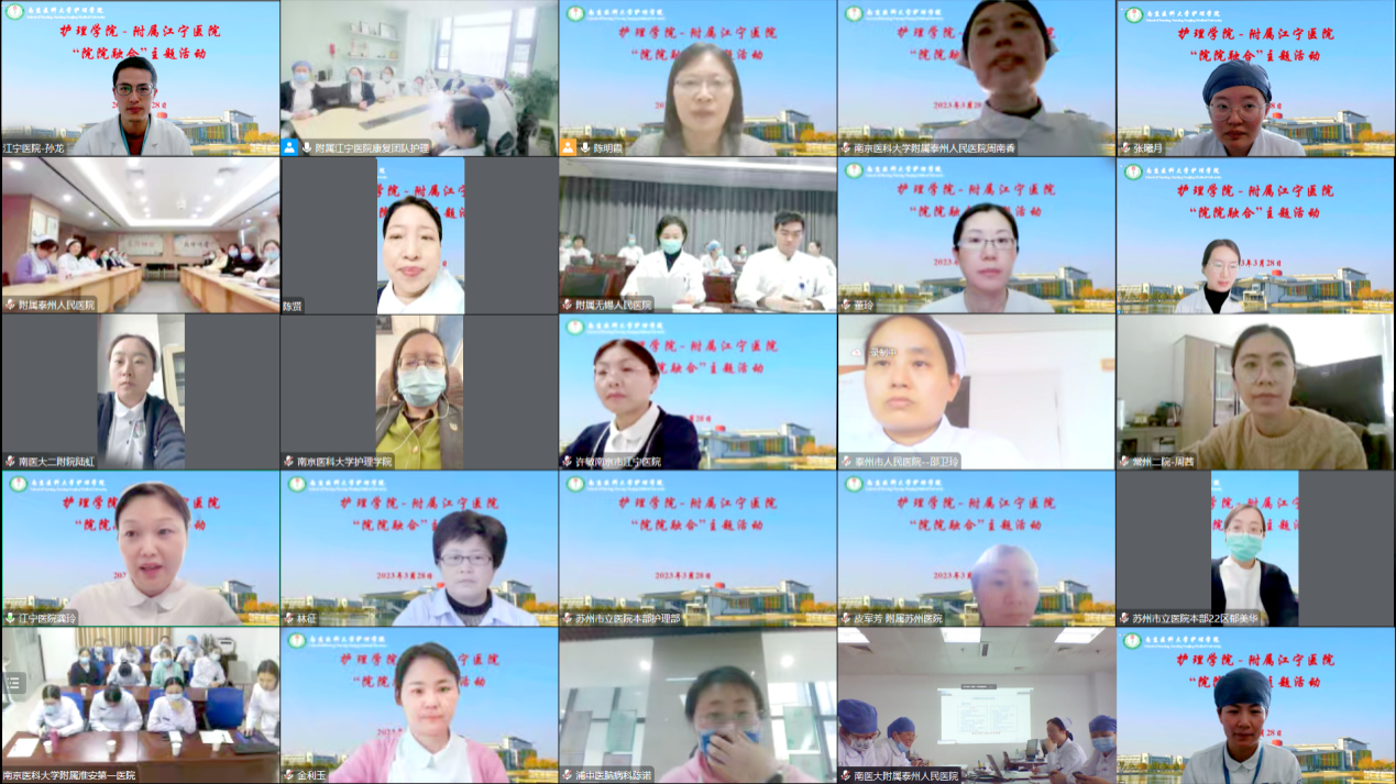 为加强学院与附属医院全方位合作和交流,进一步推进护理学科的建设和发展,3月28日下午14:00,九游娱乐(JIUYOU)官方网站_9YOU GAME与附属江宁医院联合举办了“院院融合”主题活动。本次活动依托“沿海区域护理学专业虚拟教研室”平台,采取线上交流形式,九游娱乐(JIUYOU)官方网站_9YOU GAME许勤院长、陈明霞主任及各附属医院临床护理教研室主任、副主任、临床护理教师、护理骨干等共350余人次参与本次活动。