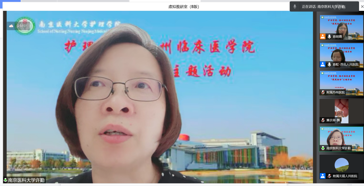 2023年4月19日下午,九游娱乐(JIUYOU)官方网站_9YOU GAME与扬州临床医学院联合举办了2023年第二期“院院融合,协同发展”主题活动。本次活动依托“沿海区域护理学专业虚拟教研室”平台,采取线上交流形式,九游娱乐(JIUYOU)官方网站_9YOU GAME许勤院长、临床护理学系陈明霞主任及学院老师,扬州临床医学院护理部陈虹主任以及各附属医院、临床教学医院的护理骨干参加了此次线上活动。
