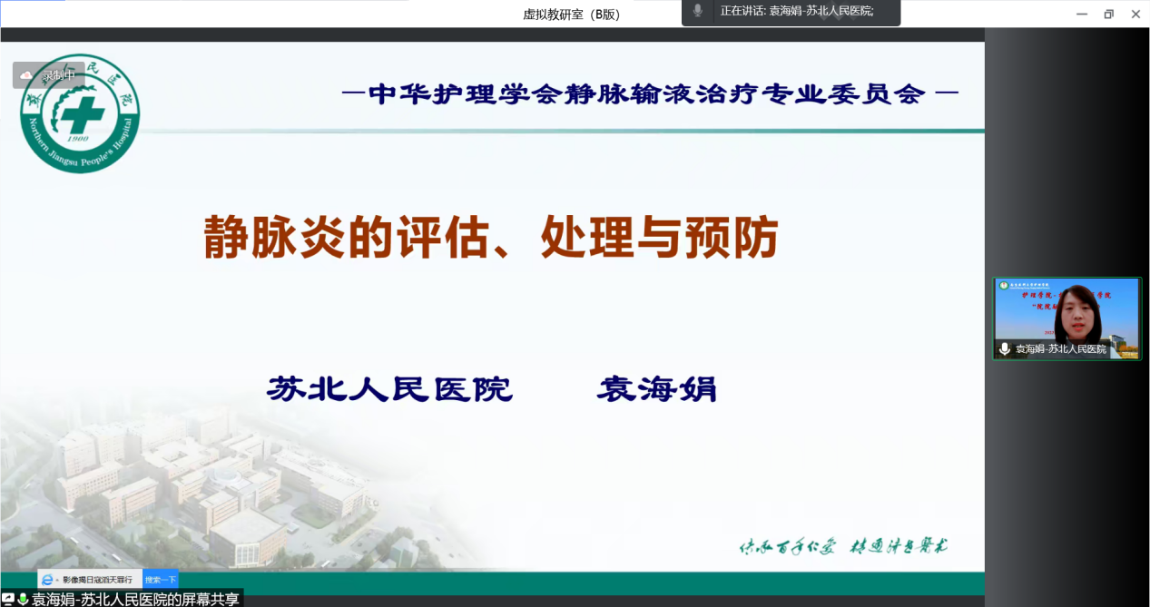 随后,扬州临床医学院袁海娟主任护师针对《静脉导管常见并发症临床护理实践指南》中有关静脉炎及导管相关性血流感染进行了深入解读和交流,通过案例导入,引发大家的思考,介绍了相关并发症的评估、处理、预防的推荐意见及具体实施方法,有理论有实践、层层推进。