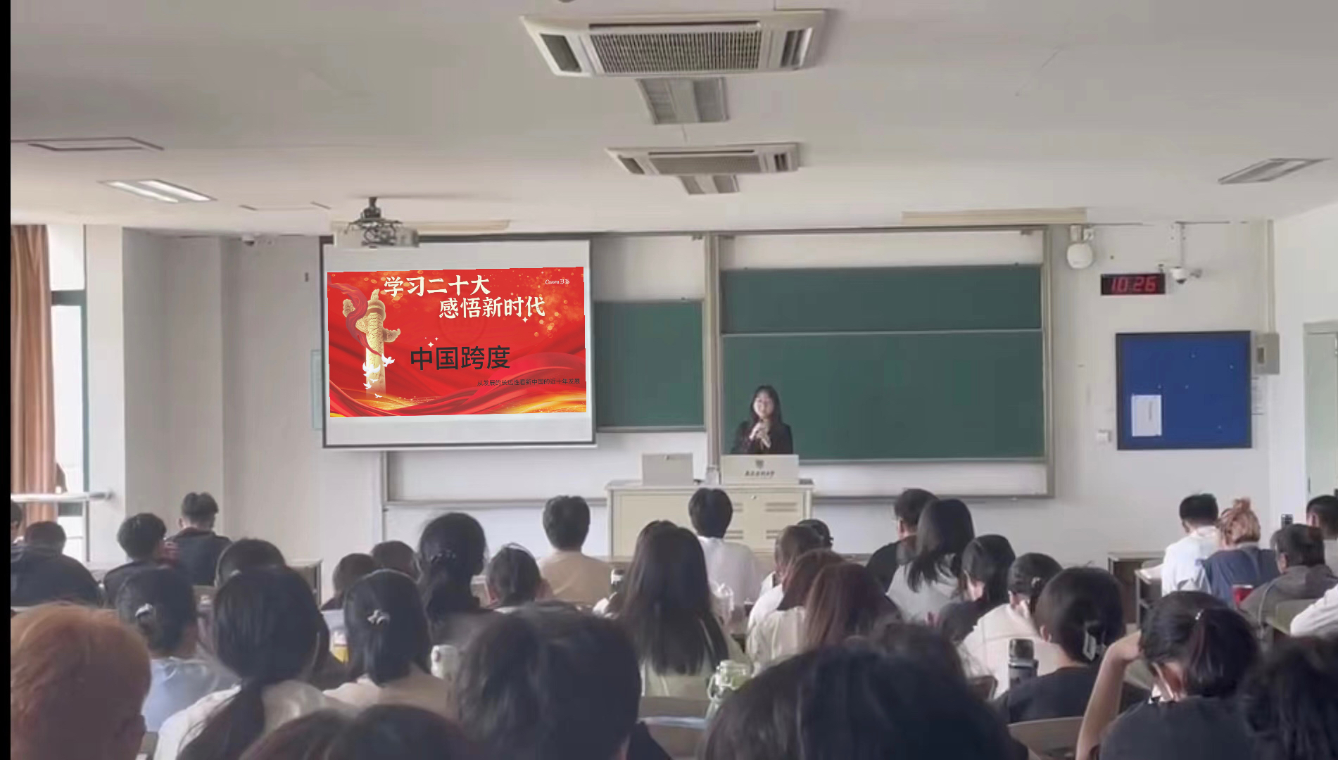 宣讲员们秉承着“为时代发声,为青春代言”的精神口号,从不同维度回顾党和国家新时代十年取得的伟大成就,展望中国式现代化的宏伟蓝图。中国高度,凝聚着中国人民不畏艰险,勇攀高峰的毅力;中国速度,展现着中国发展的日新月异;中国跨度,是我国实施创新驱动发展战略的注脚;中国力度,诠释着中国实力,展现大国华章;中国温度,让人人民切实感受安全感和幸福感;中国密度,成为国家高质量发展的注脚;中国跨度,铸就了新中国辉煌的发展历程;中国精度,是中国人精益求精的工匠精神;中国厚度,体现了厚积薄发的力量与勇气;中国广度,架起中国与世界的友好新桥梁。简短却深刻的微宣讲引起了同学们强烈的共鸣和阵阵掌声。