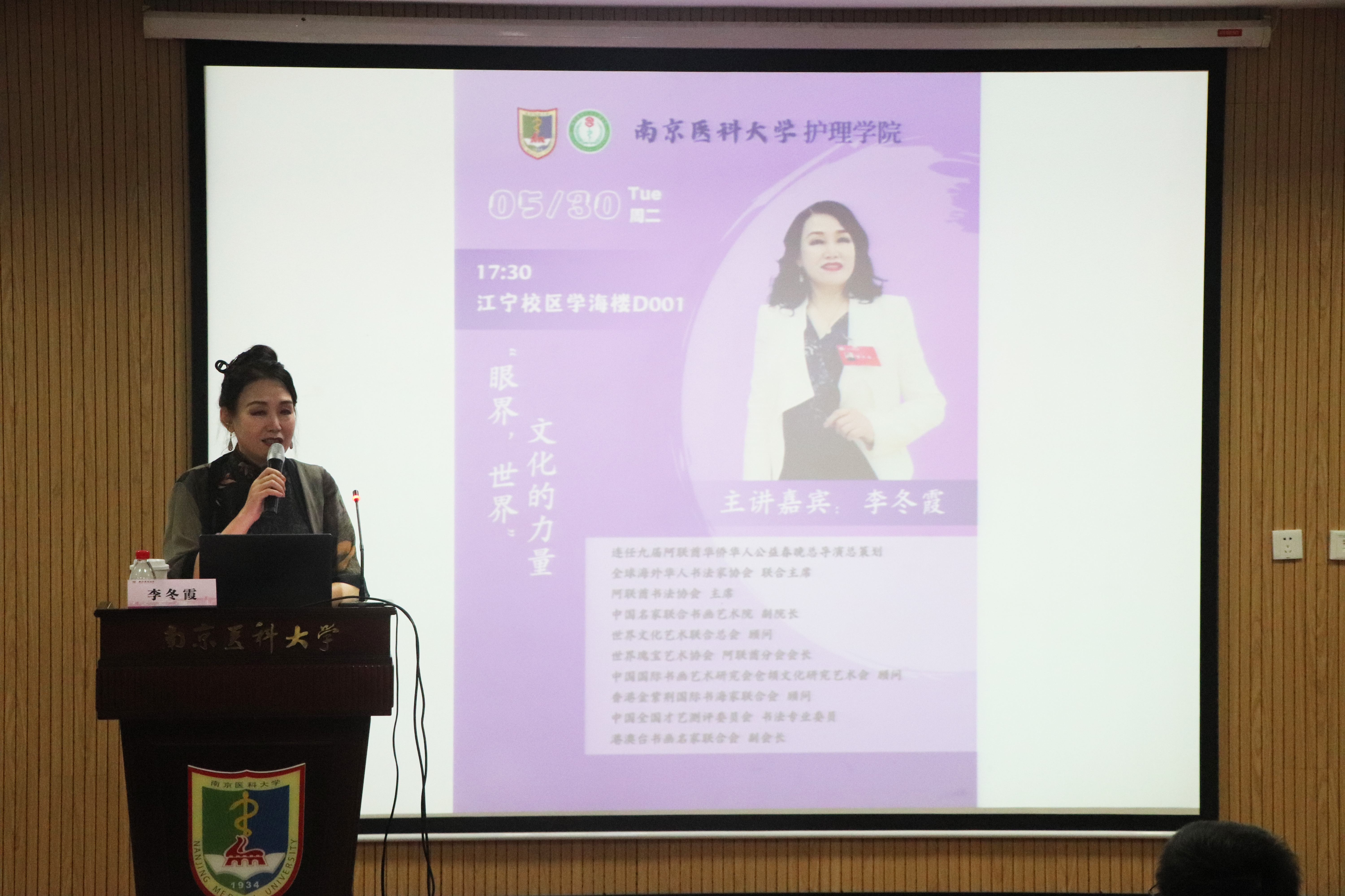 5月31日,南京医科大学客座教授李冬霞女士来护理学院交流讲学。李冬霞女士是我校82级护理校友,旅居海外33年,已连任九届阿联酋华侨华人公益春晚总导演总策划,现任全球海外华人书法家协会联合主席兼阿联酋分会主席、世界文化艺术联合总会顾问、阿联酋中华文化语言教育交流中心董事长、阿联酋书法家协会主席、阿联酋旗袍协会会长、中国山水画院迪拜分院院长、阿联酋江苏侨商总会会长。