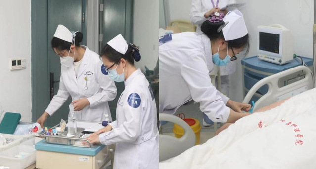 开幕式后,参赛选手们按照赛前组队和抽签顺序进入紧张的比赛过程中,根据案例信息对一名外伤急救患者进行静脉输液和氧气吸入,比赛不仅考核选手的技能熟练程度,更考核选手们的临床思维能力、团队合作意识以及人文关怀能力。选手们精神饱满,互相配合、有条不紊地操作,裁判老师们严谨认真、一丝不苟地打分。