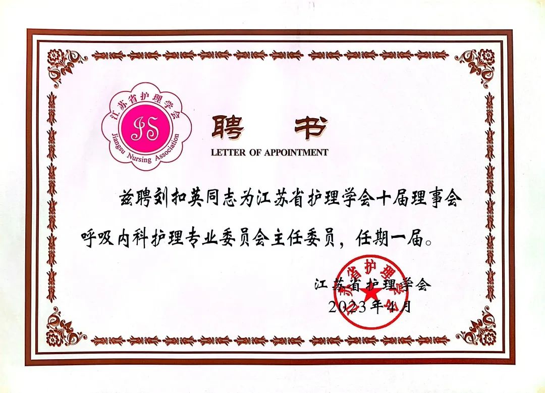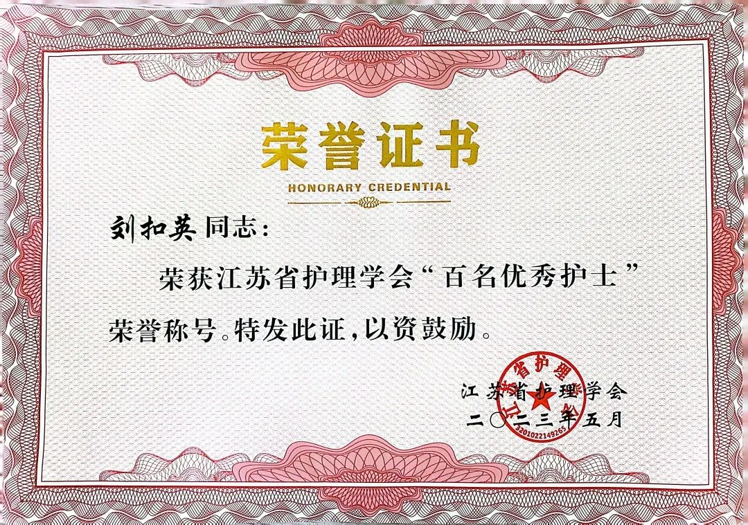 护士节前夕,在江苏省卫健委的支持下,省护理学会在全省范围内开展了江苏省“百名优秀护士”评选活动。经过层层筛选与角逐,在各市护理学会、省管医院上报的300名人选中,九游娱乐(JIUYOU)官方网站_9YOU GAME临床护理学系《内科护理学》课程负责人、一附院呼吸科与危重症医学科护士长刘扣英副教授荣获江苏省“百名优秀护士”荣誉称号。