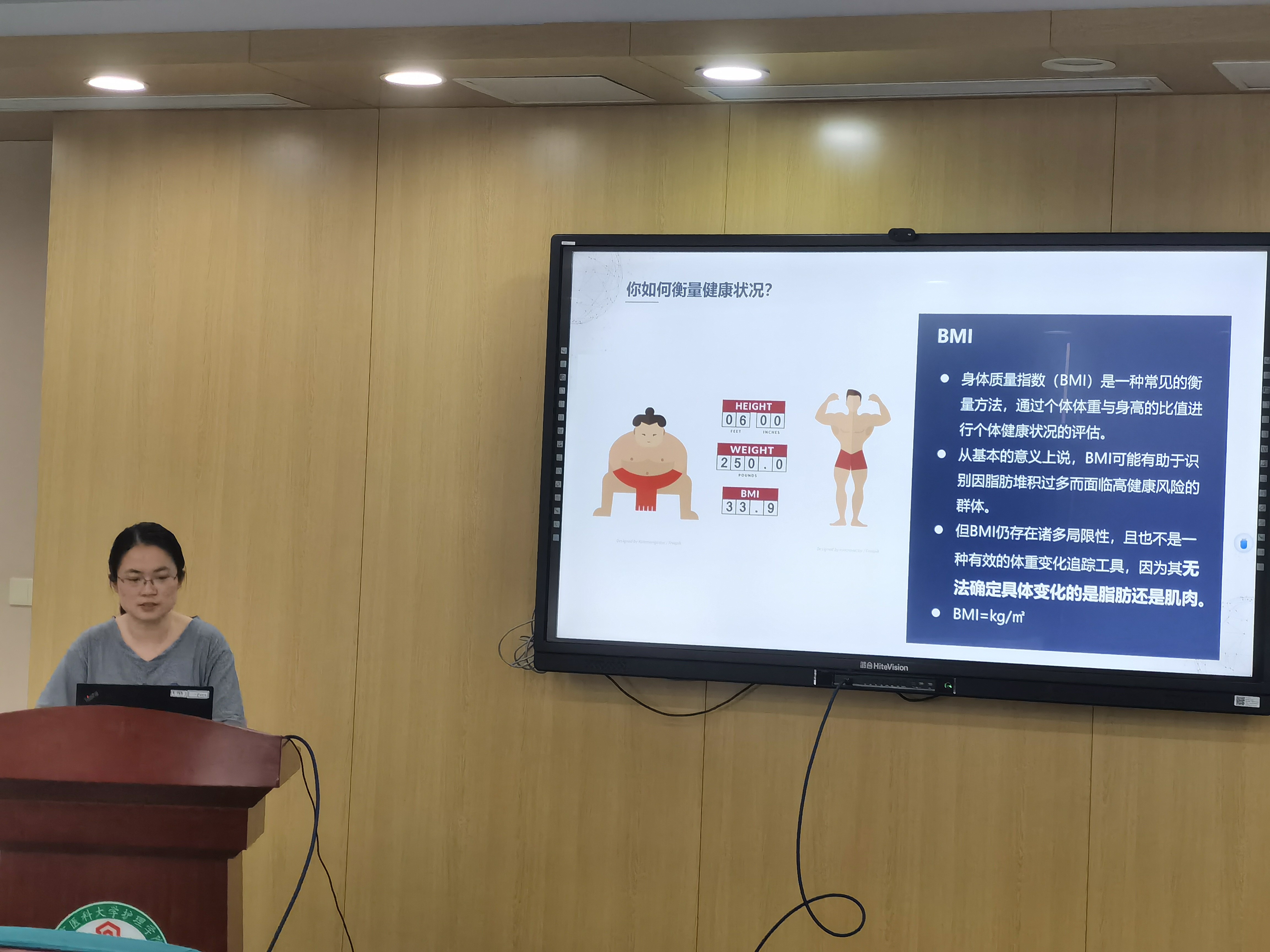 肿瘤康复与安宁疗护团队负责人朱姝芹副教授介绍了本次活动内容,胡洁蔓老师从身体成分的定义和测量、Inbody仪器使用流程、结果分析几个方面对身体成分分析仪使用展开讲解;许勤院长也从营养评估的角度对人体成分分析的具体内容进行了补充,并与参会者讨论交流不同研究中可能涉及的营养指标,鼓励老师、同学们进一步了解、使用Inbody身体成分分析仪。