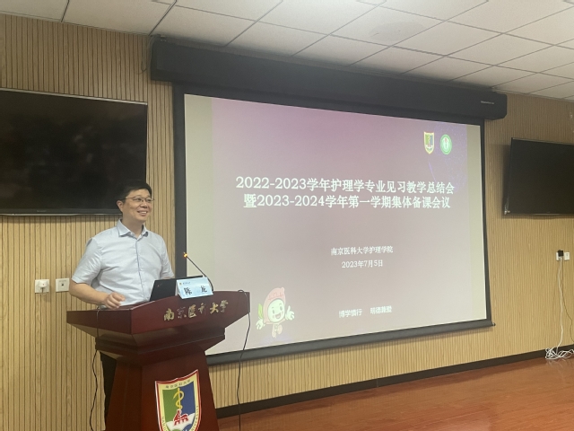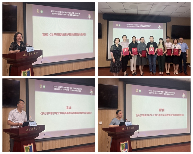 许勤院长、苏益民副书记、副院长、丁亚萍副院长先后宣读了《关于调整临床护理教研室的通知》《关于南京医科大学护理学专业教学赛事临床指导教师聘任的通知》《关于表彰南京医科大学护理学专业见习教学基地2022-2023学年见习教学研究成果的通知》,鼓励护理学专业见习教学基地的教师积极投身临床教学,争当表率。