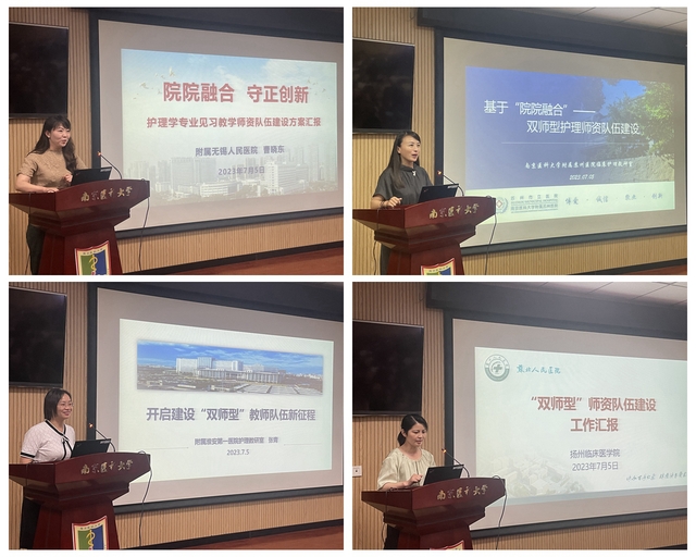 见习教学基地(含拟建)做双师型师资队伍建设汇报。附属无锡人民医院护理部主任曹晓东、附属苏州医院护理部主任蒋玲、附属淮安第一医院护理部主任张青、苏北人民医院教育培训处副处长顾志娥、镇江市第一人民医院护理部副主任庄利梅、附属常州第二人民医院临床护理教研室副主任李小娜、附属泰州人民医院护理部主任冯国琴先后围绕见习教学师资现况、建设目标、建设举措等方面汇报交流。