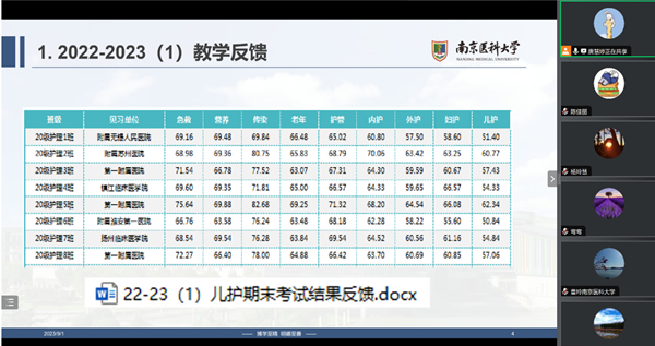 2023年9月1日晚19:30,《儿科护理学》课程教学团队通过腾讯会议平台进行了2023-2024学年第一学期理论授课的集体备课会议。会议由课程负责人唐慧婷老师主持,所有参与课程理论教学的授课老师均准时参会,包括学院老师崔焱、董玲,第二附属医院老师潘菲、曹大华、王艳,附属儿童医院老师蔡榕、彭明琦、杨玲慧。