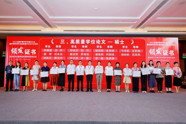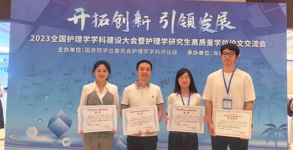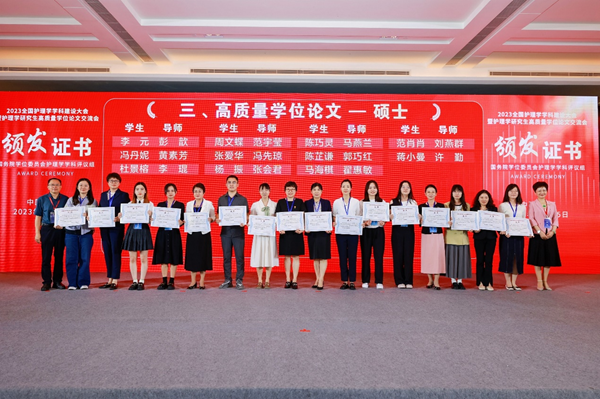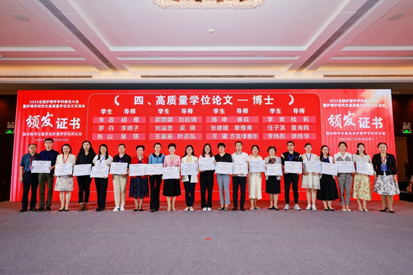 大会宣读了护理学高质量学位论文的评审结果,我院研究生培养成果得到了护理学学科评议组的充分肯定,共有3篇学位论文获得高质量论文表彰,分别是崔焱教授指导的博士论文“吞咽障碍患者隐性误吸声学检测法及风险预测模型构建”(陈申),许勤教授指导硕士论文“基于跨理论模型的运动康复干预在减重手术患者中的应用效果研究”(任子淇)和“老年胃癌患者术前衰弱与代谢综合征的关系及对术后并发症的影响研究”(蒋小曼)。共有4篇学位论文获得提名奖,分别是崔焱教授指导的博士论文“养老机构老年人迁居适应故事讲述干预方案构建及应用效果评价”(孙昌仙)、“安宁疗护护士胜任力模型构建”(朱姝芹),“基于真实世界数据的代谢相关脂肪性肝病风险预测模型构建及高危人群风险管理效果评价”(张茹),许勤教授指导的硕士论文“基于补偿结转行为模型的减重代谢术后患者健康行为交互作用机制及干预策略研究”(赵康)。