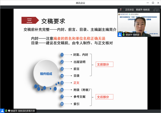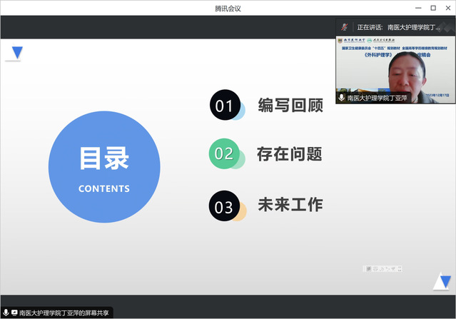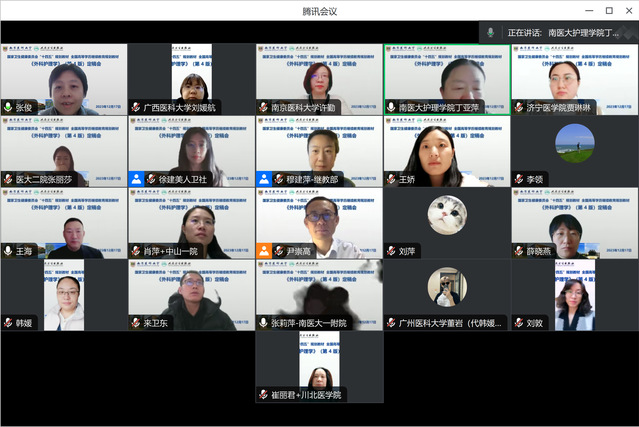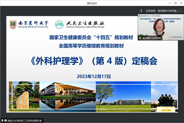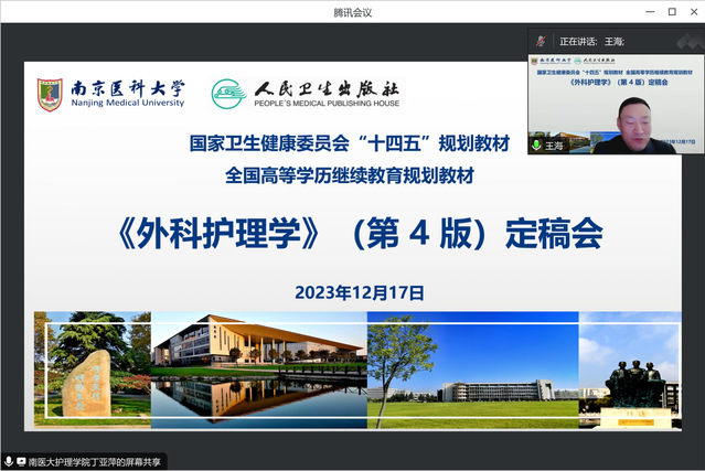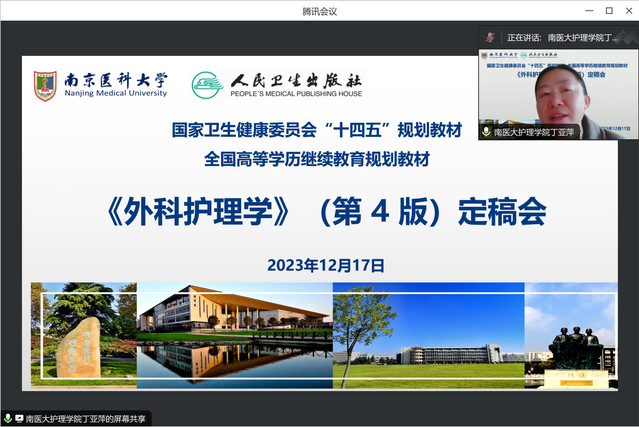 2023年12月17日,由南京医科大学护理学院丁亚萍副院长和山东第二医科大学九游娱乐(JIUYOU)官方网站_9YOU GAME尹崇高副院长共同担任主编,人民卫生出版社国家卫生健康委员会“十四五”规划教材、全国高等学历继续教育规划教材《外科护理学(第4版)》定稿会在线顺利召开。人民卫生出版社穆建萍编辑、徐建美编辑,南京医科大学继续教育学院王海院长,九游娱乐(JIUYOU)官方网站_9YOU GAME许勤院长,以及来自全国18所医学院校的20名编委参加会议。会议由丁亚萍主编主持。