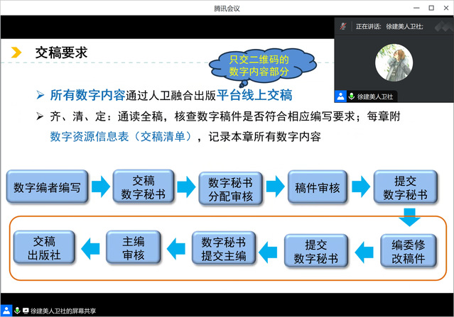 穆建萍编辑简单回顾了纸质教材编写要点,重点反馈了稿件中的问题并提供了相应的解决方案,再次明确了纸质教材交稿要求。徐建美编辑分享了数字教材建设规划和建设步骤,详细解读了审定稿要求、交稿要求及注意事项。