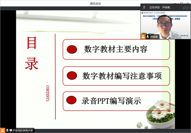 接着,丁亚萍主编介绍了纸质教材的总体编写情况,梳理出审稿过程中存在的12个共性问题,阐述了具体修改意见与建议,同时部署了定稿会后的具体编写任务和进度安排。尹崇高主编介绍了数字教材的主要内容、编写要求及注意事项,强调要将课程思政融入数字教材,不忘立德树人的教育初心。