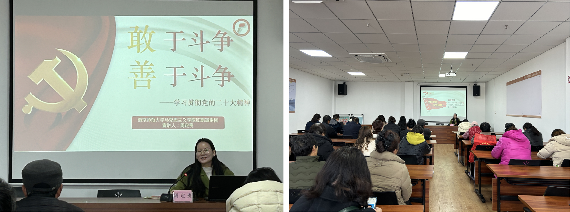 南京师范大学马克思主义学院红旗宣讲团以《敢于斗争、善于斗争——学习贯彻党的二十大精神》为题,讲述了斗争精神的内涵、发扬斗争精神的重要性以及如何发扬斗争精神,结合具体案例,对如何养成斗争精神,增强斗争本领,持续彰显新时代的巾帼力量带来新的启发。