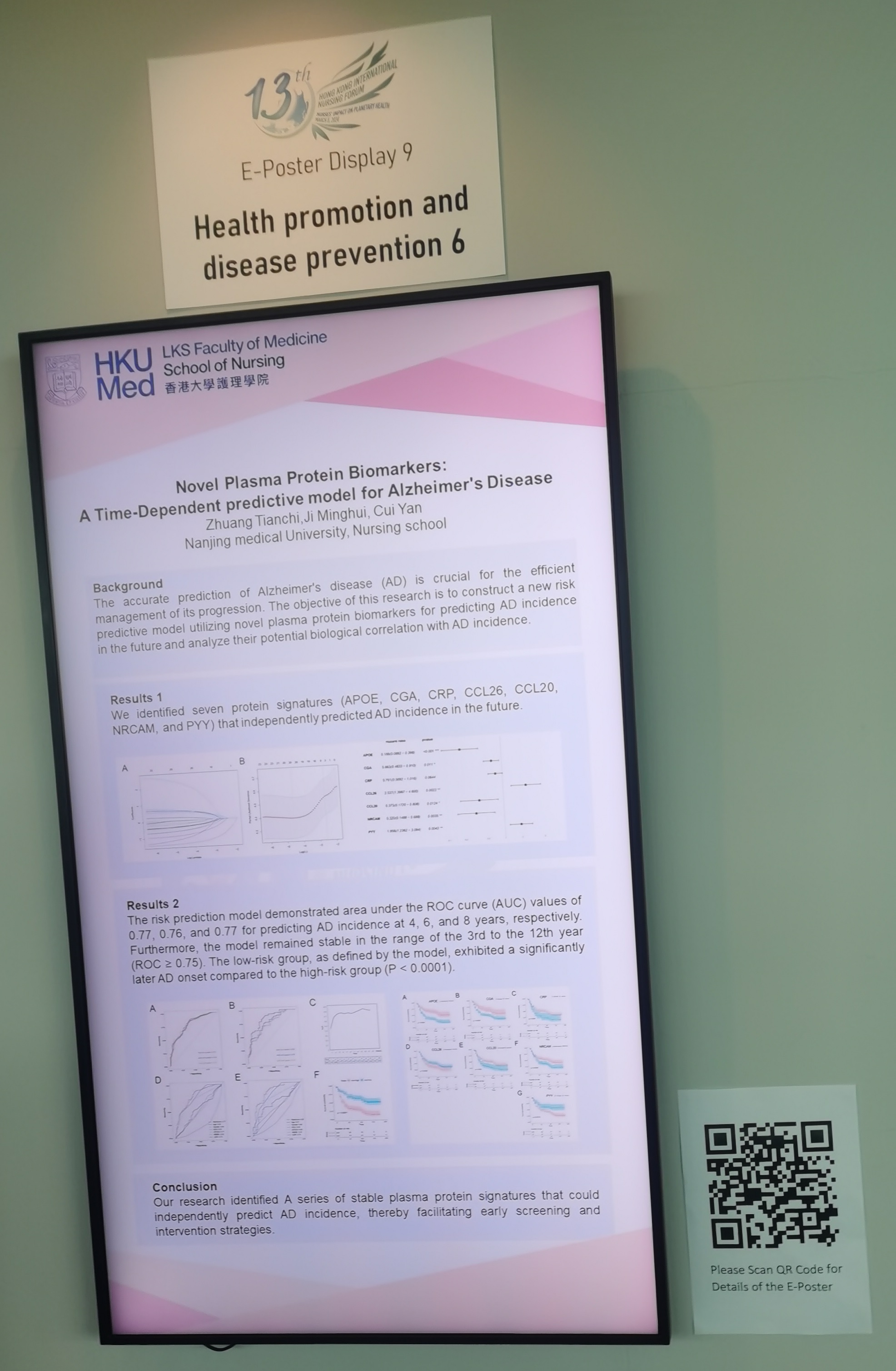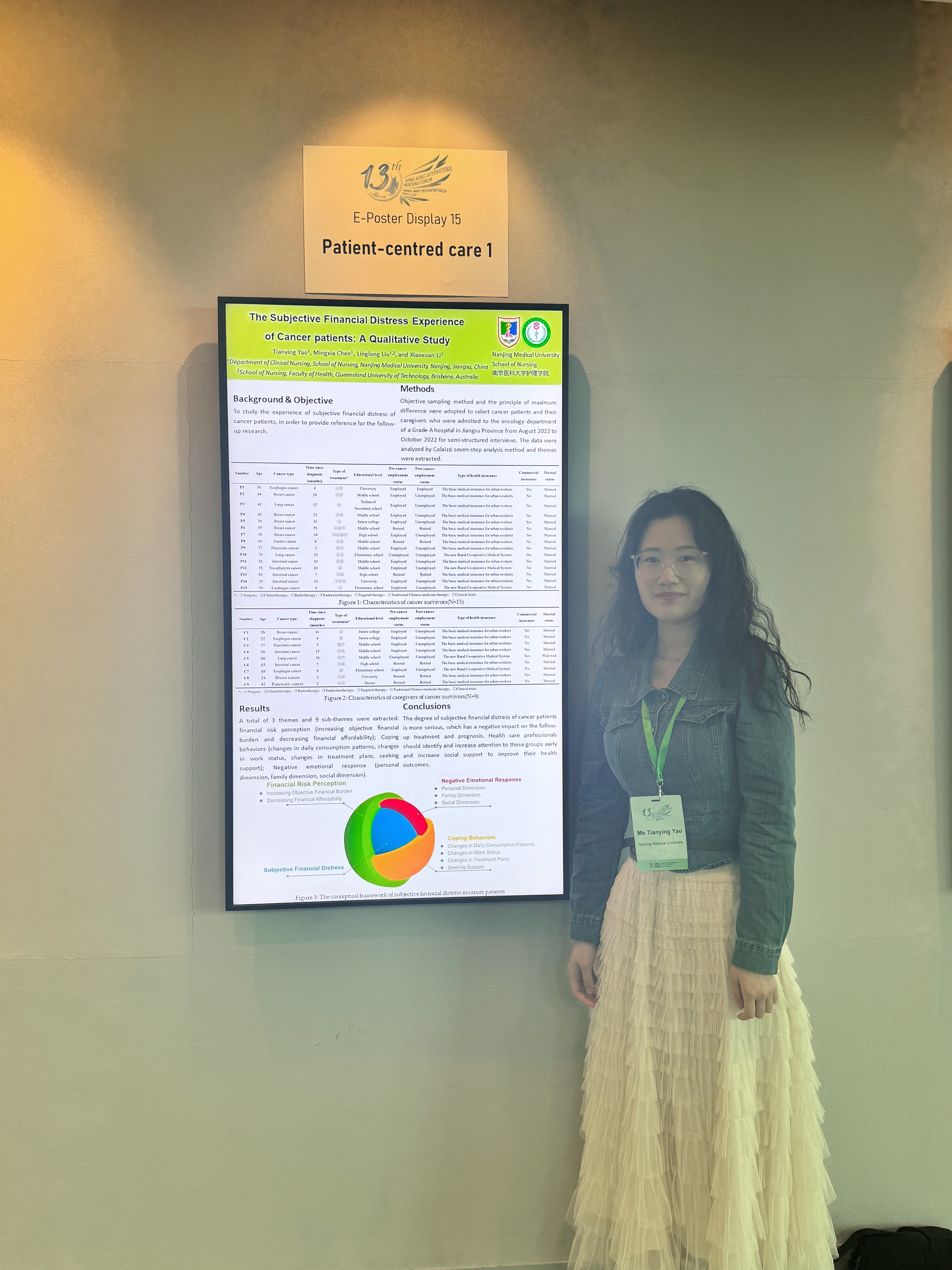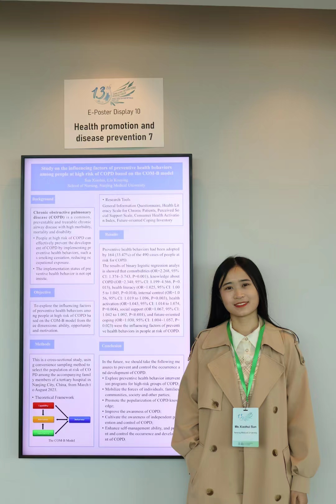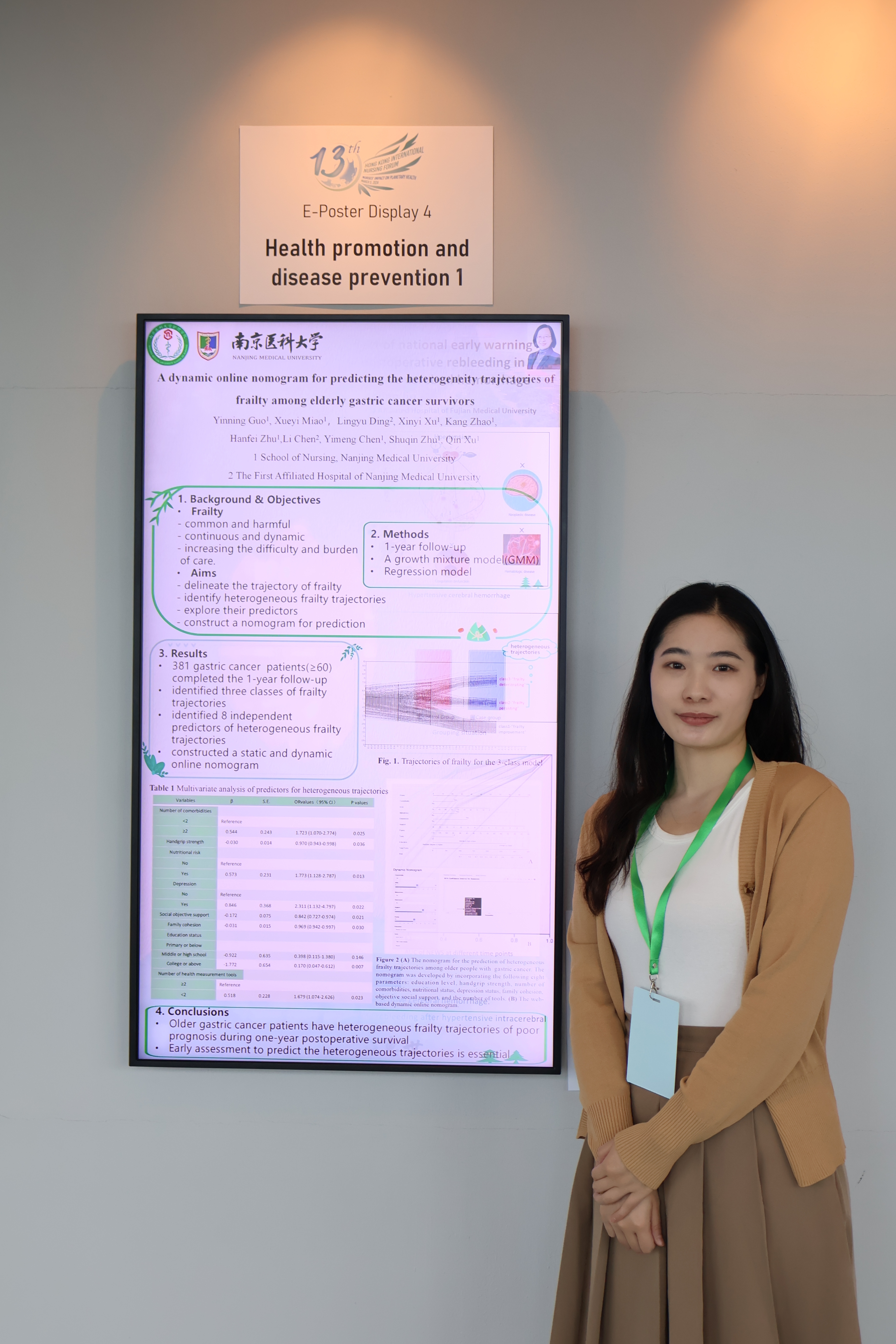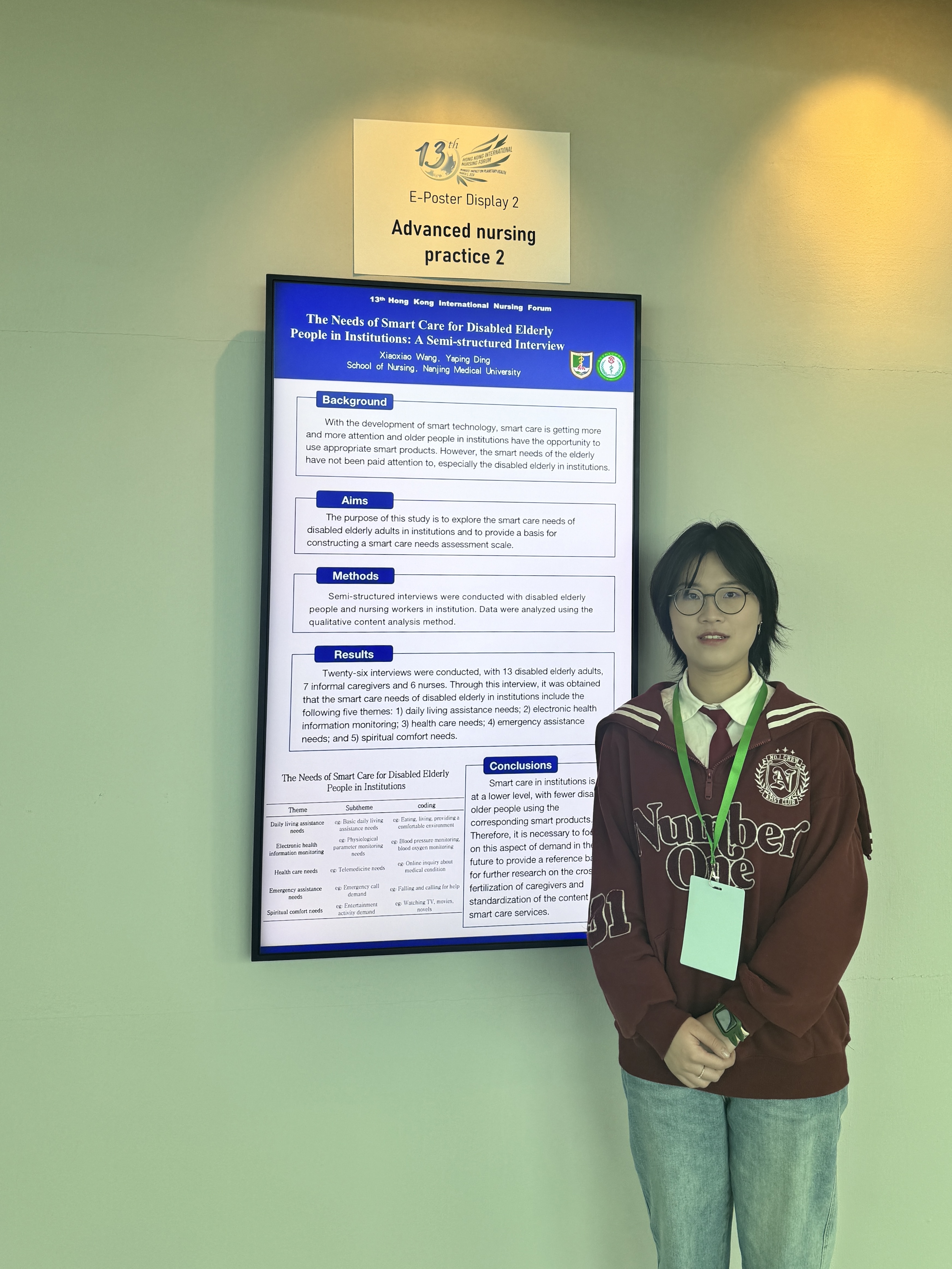 会议期间,我院研究生展示的五篇电子海报分别为:Identification and Analysis of Plasma Protein Characteristics for Predicting the Risk of Alzheimer's Disease(庄天驰,导师崔焱教授)。A dynamic online nomogram for predicting the heterogeneity trajectories of frailty in older people with gastric cancer(郭银宁,导师许勤教授)。The Needs of Smart Care for Disabled Elderly People in Institution: A Semi-structured Interview(汪晓晓,导师丁亚萍副教授)。The Subjective Financial Distress Experience of Cancer patients: A Qualitative Study(姚天颖,导师陈明霞副教授)。Study on the influencing factors of preventive health behaviors among people at high risk of chronic obstructive pulmonary disease based on the COM-B model (孙晓慧,导师刘扣英副教授)。同学们就自己的课题研究内容及成果与参会学者展开了深入的学术讨论与交流。