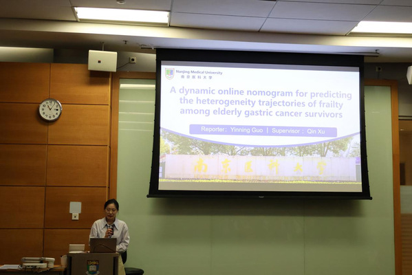 郭银宁同学在“老年医学及长期护理”会场做题为《A Dynamic Online Nomogram for Predicting the Heterogeneity Trajectories of Frailty Among Elderly Gastric Cancer Survivors》的研究汇报,研究采用增长混合模型刻画了患者术后一年的衰弱轨迹,共识别3类轨迹:衰弱改善型(class1);衰弱持续型(class2)和衰弱恶化型(class3),确定了异质性衰弱轨迹(class2和class3),使用多元回归模型确定异质性衰弱轨迹的预测因素,并据此构建了预测老年胃癌幸存者衰弱异质性轨迹静态和动态列线图,用于术前预测和识别异质性衰弱轨迹的高危患者,实现术前风险分层。新加坡国立大学的吴曦教授对该研究的价值表达了高度的认可,希望未来深入合作的机会。本研究在会后也受到了日本大阪大学等多个院校学者的关注与讨论。