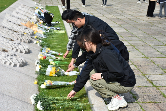 上午9点,同学们来到园区,怀着的崇敬的心走向烈士群雕像处,这些雕像再现先烈们在就义前英勇不屈、视死如归的光辉形象。同学们自发排队,向烈士默哀,表达对英勇牺牲的烈士们的深深敬意和无尽哀思。同学们走向烈士雕像,将手中的鲜花献给这些为国家、为人民献出生命的英雄。每一束鲜花都寄托着同学们对烈士们的崇高敬意和深切怀念。