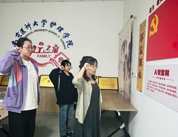 大会接受两名发展对象。他们宣读了《入党志愿书》,汇报了入党动机、履历、家庭关系及思想情况。入党介绍人介绍了他们在考察期的综合表现,并对其能否入党表明意见。支委会报告了两名发展对象的审查情况和意见。经表决,全体党员一致同意接受他们为中共预备党员。支部书记杨柳为两名同志佩戴党徽并宣誓。