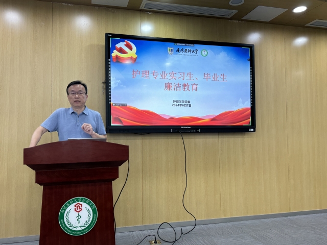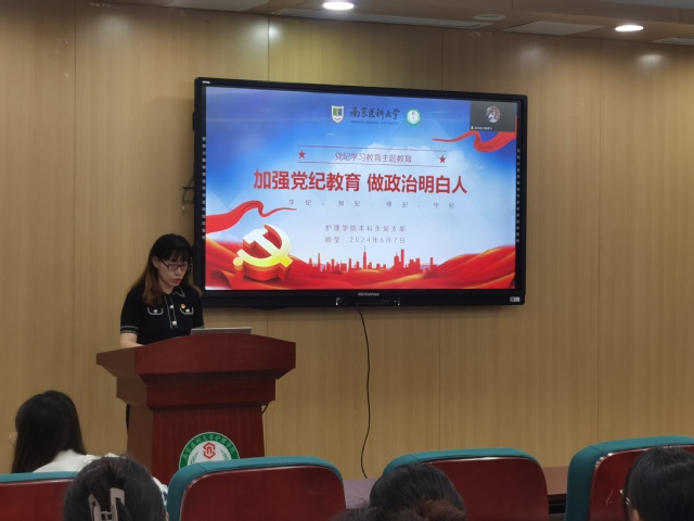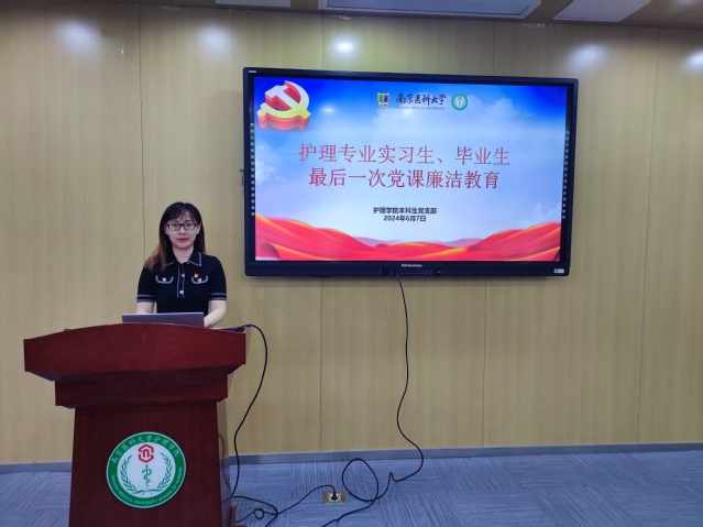 首先,由本科生党支部书记顾莹老师主讲党纪学习教育专题党课《加强党纪教育做政治明白人》。党课围绕党纪学习教育的背景,深刻认识加强党的纪律建设的重要性,深入领会开展党纪学习教育的必要性和加强《《中国共产党纪律处分条例》》学习展开。接下来,顾老师专门开展了护理专业实习生、毕业生廉洁教育。她举出一些护士在工作岗位中因贪腐“落马”的案例,结合工作的重要节点,警醒同学们明底线,知敬畏,从而自觉学纪、准确知纪、心中明纪、严格守纪。