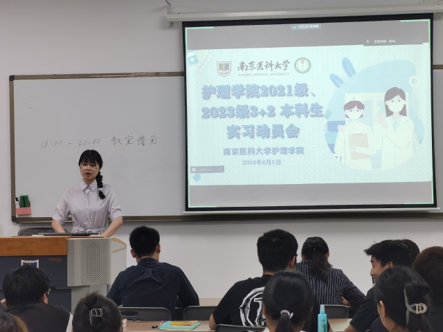 2024年6月5日晚上,护理学院举办2021级、2023级3+2联培护理学专业实习动员会,动员会以五台校区3-303为主会场,其他驻点班级线上参加。学院副书记、副院长高兰天,副院长嵇艳,校教务处专业教育科科长李瑞恒老师,全体2021级、2023级3+2联合培养护理学专业学生参加会议。会议由辅导员张未老师主持。