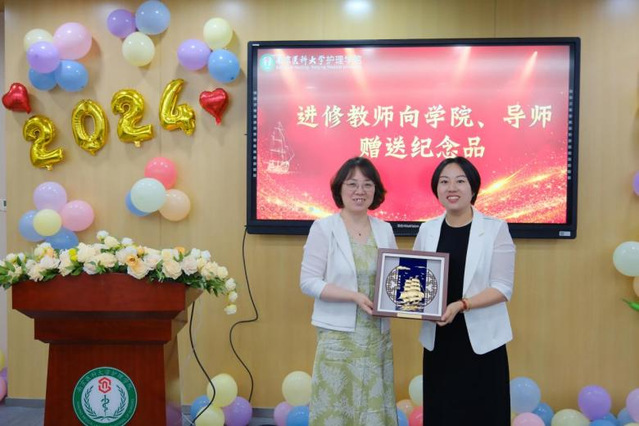 欢送环节,进修教师向学院赠送纪念品“精益扬帆”,与学院“精益扬帆”教学提升系列活动呼应,祝愿学院乘风破浪再创辉煌;学院向进修教师赠送建校九十周年定制马克杯,希望各位进修教师在今后的工作中秉承“承九秩初心 弘护理仁心”的信念,为护理事业发光发热。