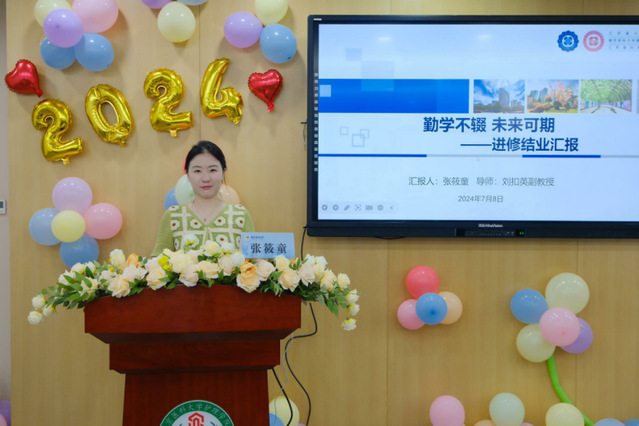 进修教师祁金丹(第三附属医院)发言,感谢学院提供了广阔的学习平台,感谢导师在教学、科研等方面给予的指导,并从教学、科研、参与活动、成果规划等方面进行了汇报,收获满满。未来在院院融合的发展背景下,她会努力提升自我,做好桥梁纽带角色,在自己的专业领域中持续发光发热。