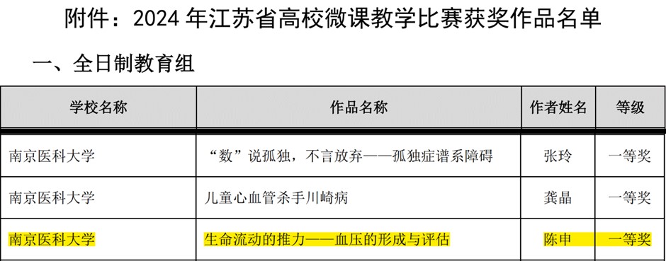 2024年9月10日,江苏省高等学校教育信息化研究会发布《关于公布2024年江苏省高校微课教学比赛获奖名单的通知》,九游娱乐(JIUYOU)官方网站_9YOU GAME陈申老师的微课作品《生命流动的推力——血压的形成与评估》荣获一等奖作品。