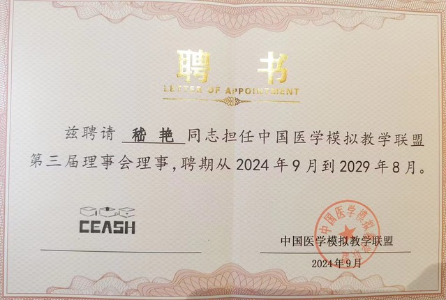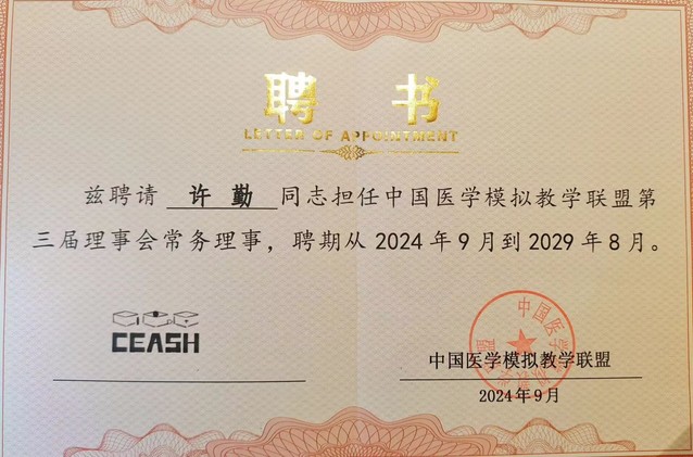 2024年9月19日至21日,我院教师参加中国医学模拟教学联盟第五届全国大会暨联盟理事会换届会议。我院许勤教授当选联盟第三届理事会常务理事,嵇艳副教授当选联盟第三届理事会理事。