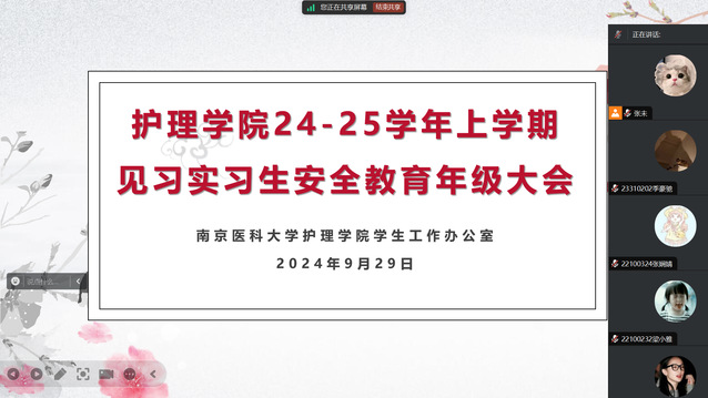 9月29日,见习实习生安全教育主题年级大会通过线上形式开展,辅导员张未老师主持会议,2021级、2022级、2023级3+2、2024级3+2学生参加。此次年级大会重点从网络安全、交通安全、防火用电安全等方面进行宣传教育,旨在强化学生的安全意识,提前做好预防措施,提高安全风险防范能力,确保学生国庆假期期间的安全。同时,各驻点班开展安全教育主题班会,再次强调国庆假期安全注意事项。