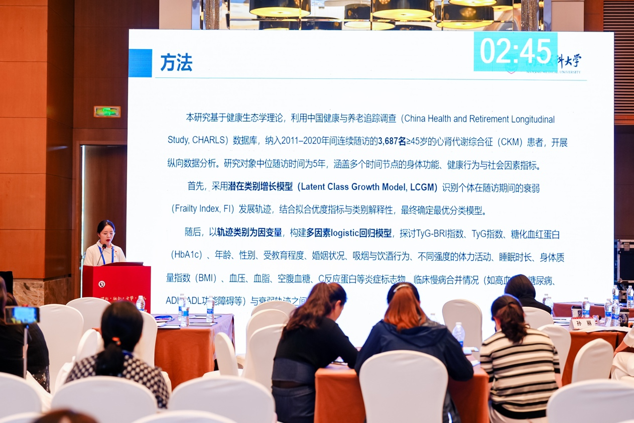付中敏同学作题为《中老年心血管-肾脏-代谢综合征人群衰弱异质性轨迹及其影响因素研究》的学术汇报,分享了该研究的主要发现与进展,提示应关注基础健康状况欠佳但代谢负担突出的“隐性高危”人群,建议对此类人群实施差异化早期干预策略。