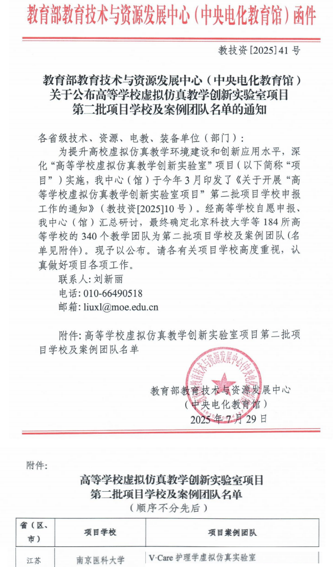 7月29日,教育部教育技术与资源发展中心(中央电化教育馆)公布《高等学校虚拟仿真教学创新实验室项目第二批项目学校及案例团队名单》(教技资[2025]41号),由我院许勤教授主持申报的“V·Care护理学虚拟仿真实验室”成功入选。