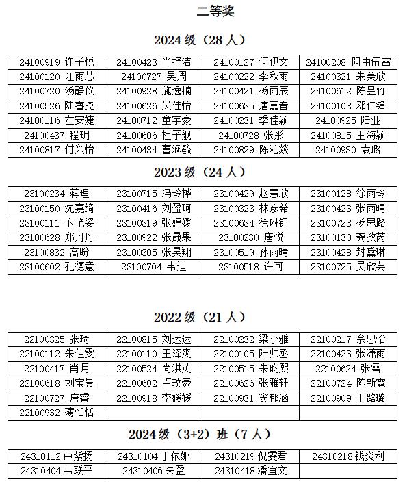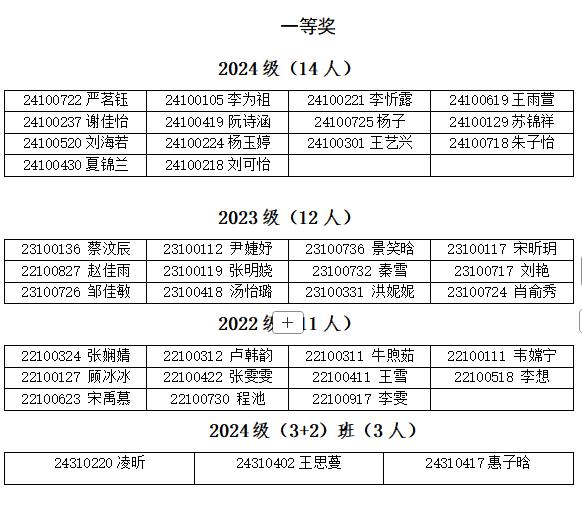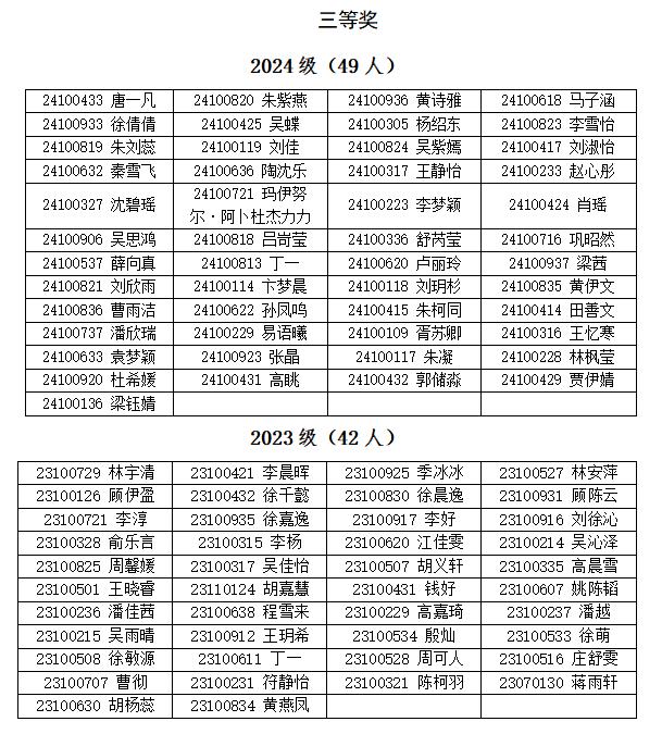 根据学校《关于评选2024-2025学年本科生优秀学生奖学金的通知》,结合《南京医科大学本科生优秀学生奖学金评定办法》,本着公平、公开、公正的原则,经学生本人确认学年学业成绩与发展性素质得分,综合考虑学年学业总评成绩和发展性素质情况,按学年学业总评成绩排序确定获奖人选范围,按发展性素质排序确定最终奖项分配。最终确定以下同学为优秀学生奖学金获得者。具体名单公示如下: